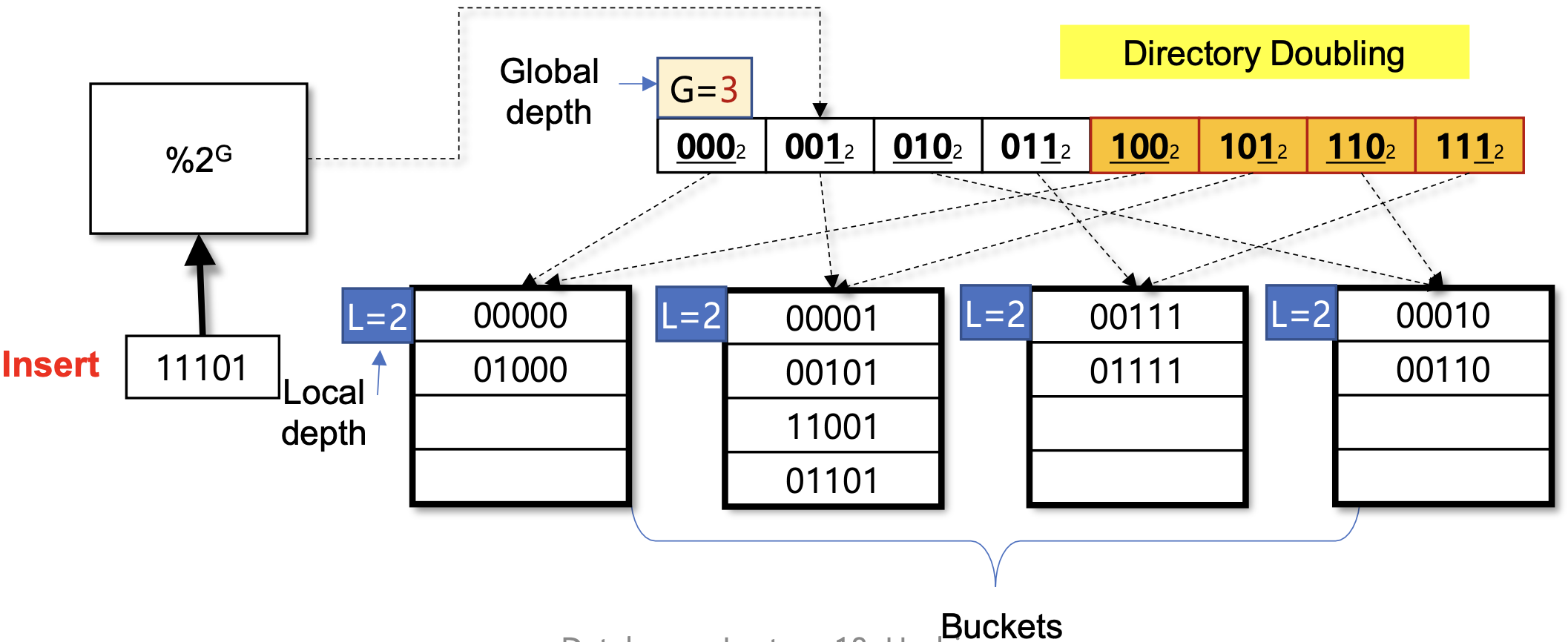 - G > L 이고 collision이 나면 bucket을 split (01, 11 둘다 같은 bucket 가리키던걸 01, 11 각각 가리키는 bucket으로 split 시키자)