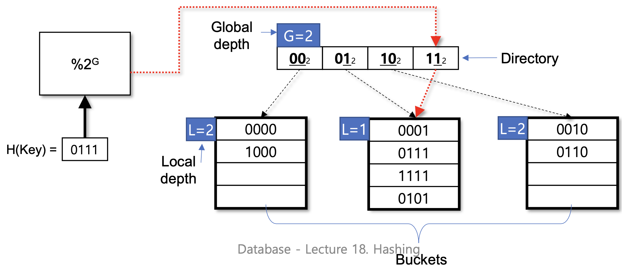 - Global depth = 2 -> H(key)에서 prefix or suffix 2개를 바탕으로 indirect 해줘야지