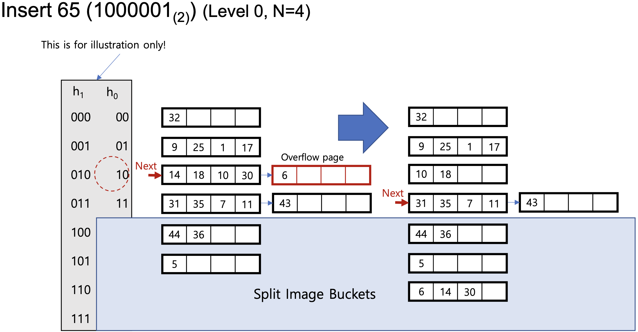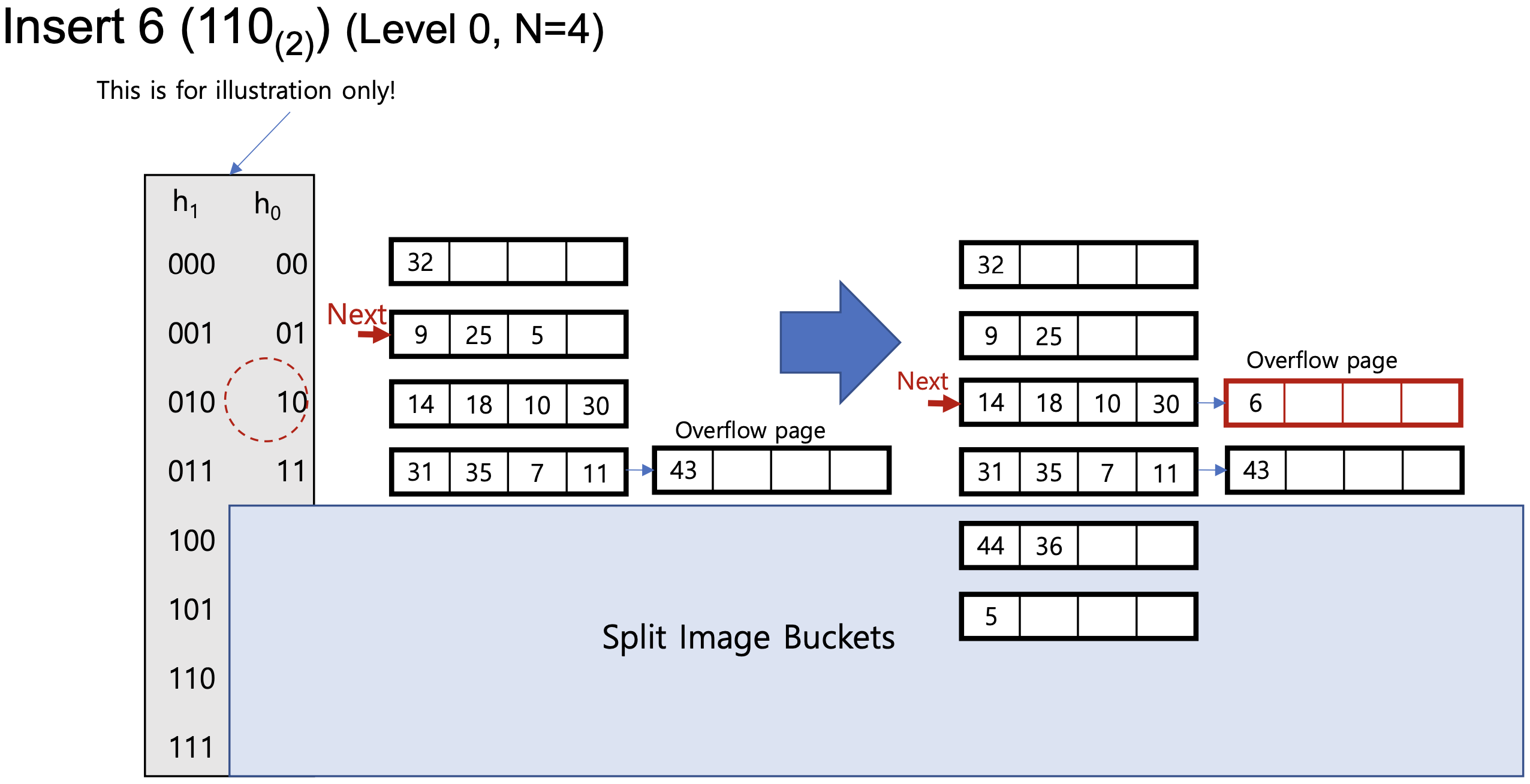 - Bucket에 overflow가 발생하면 Next Pointer가 가리키고 있는 bucket이 split 된다.