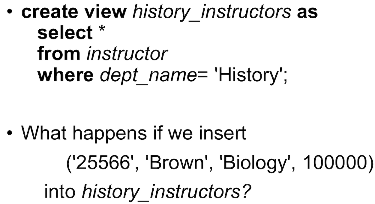 - view에 실제 table에는 존재하는 attrbute가 없다면? -> null로 넣어?, reject 해?