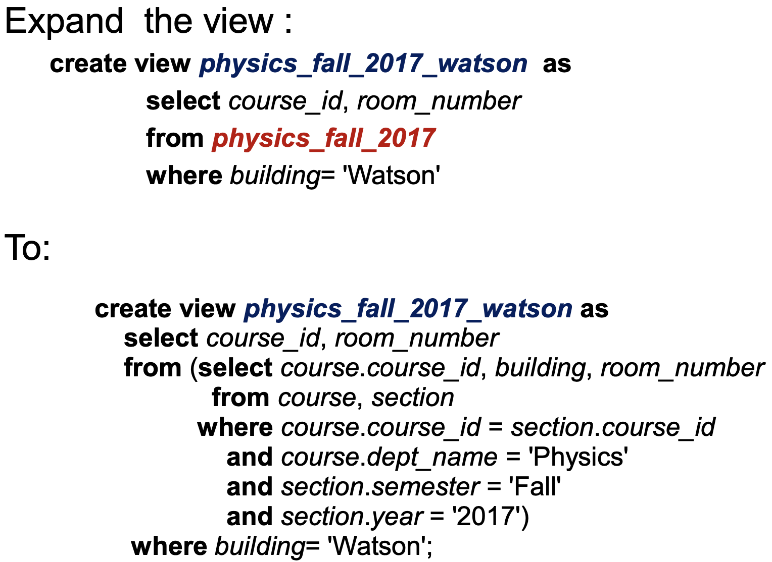 - Database will recursively replace the view references until only base tables remain
