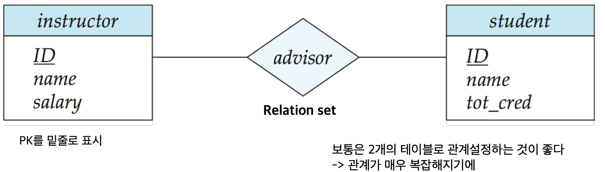- 쓰는 이유: 만약 section에 course_id attribute를 추가하면 되겠지만, 두 entity set간 duplicated course_id가 생기고, 굳이 entity set을 나눌 필요 x => sucks