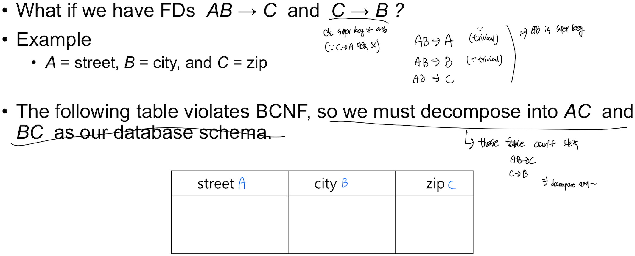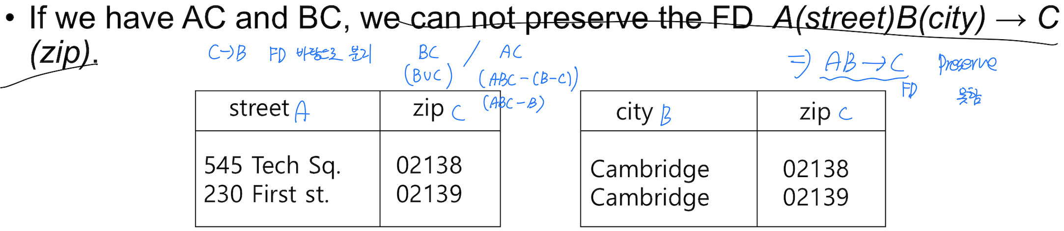 하지만 BCNF와 Dependency preservation은 완벽히 공존할수 없어