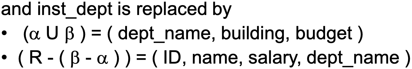 - 위와 같이 2개의 table reconstruction(Natural Join)하면 original table이 나오니 이건 잘한 decomposition