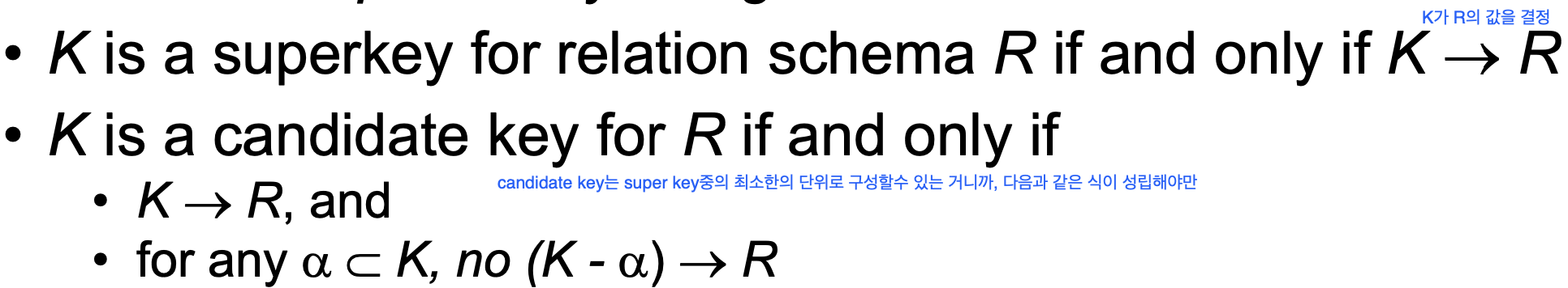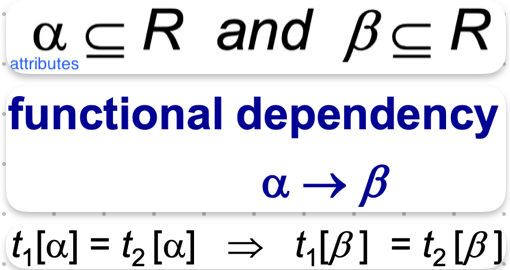 - functional dependency로 A → B, B → C이면, A → C 추론 할수 있다. (Closure)