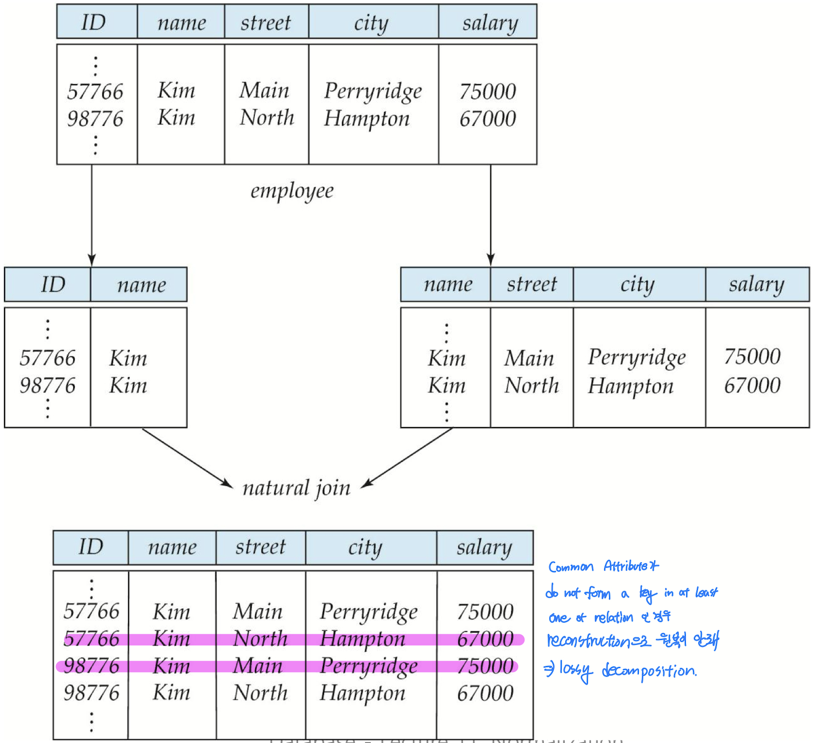- Decompose한 table로 reconstruction(Natural Join)하면 original table로 돌아가지 못해