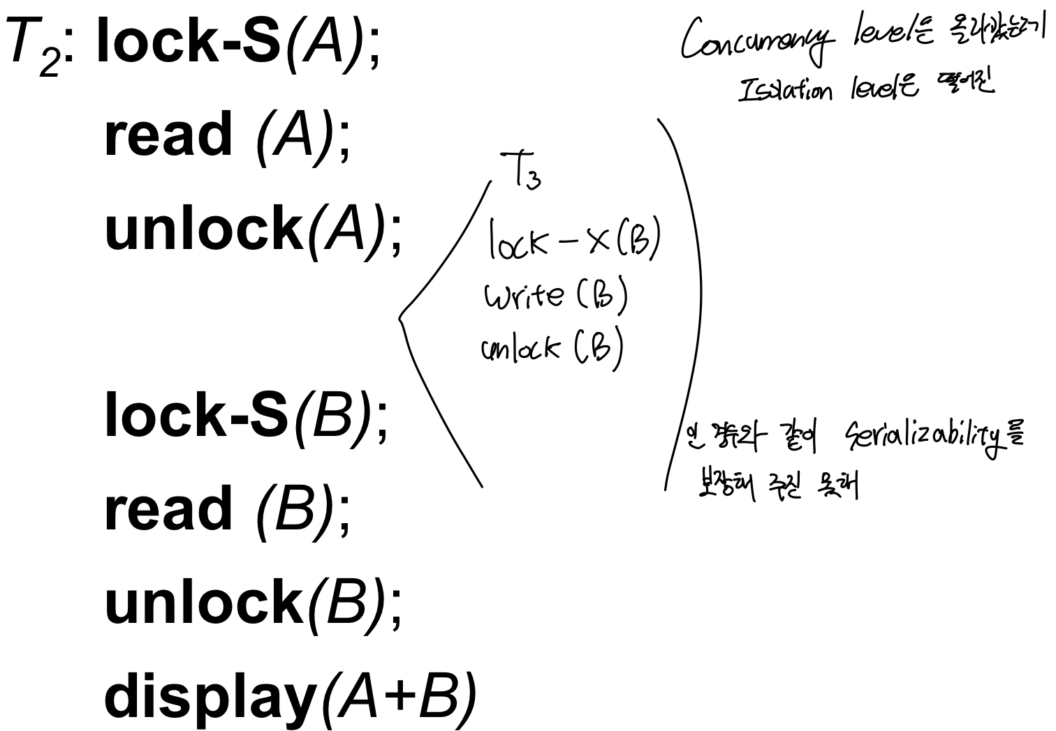 - 같은 transaction이 특정 data의 lock을 풀고 바로 다시 같은 lock을 잡는건 불가능 해