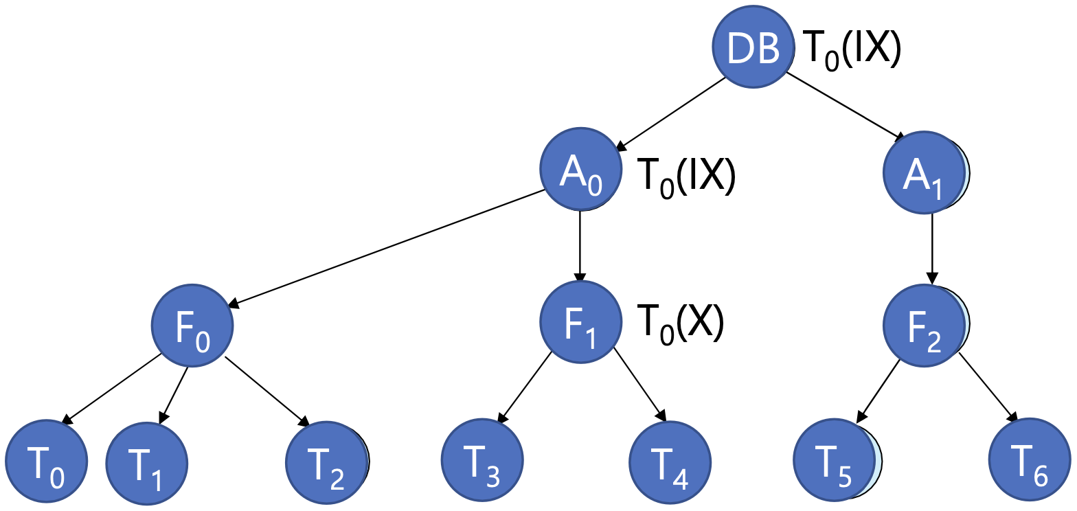 - Intention-exclusive(IX): 내 밑에 있는 애들 중, shared lock or exclusive lock이 걸려 있는 친구들이 있어