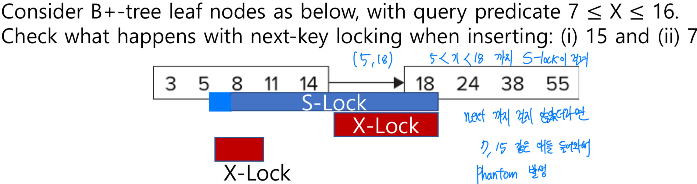 - 데이터를 읽는 transaction은 해당 data가 포함된(포함될 수 있는) 인덱스의 리프 노드에 S-lock 잠금