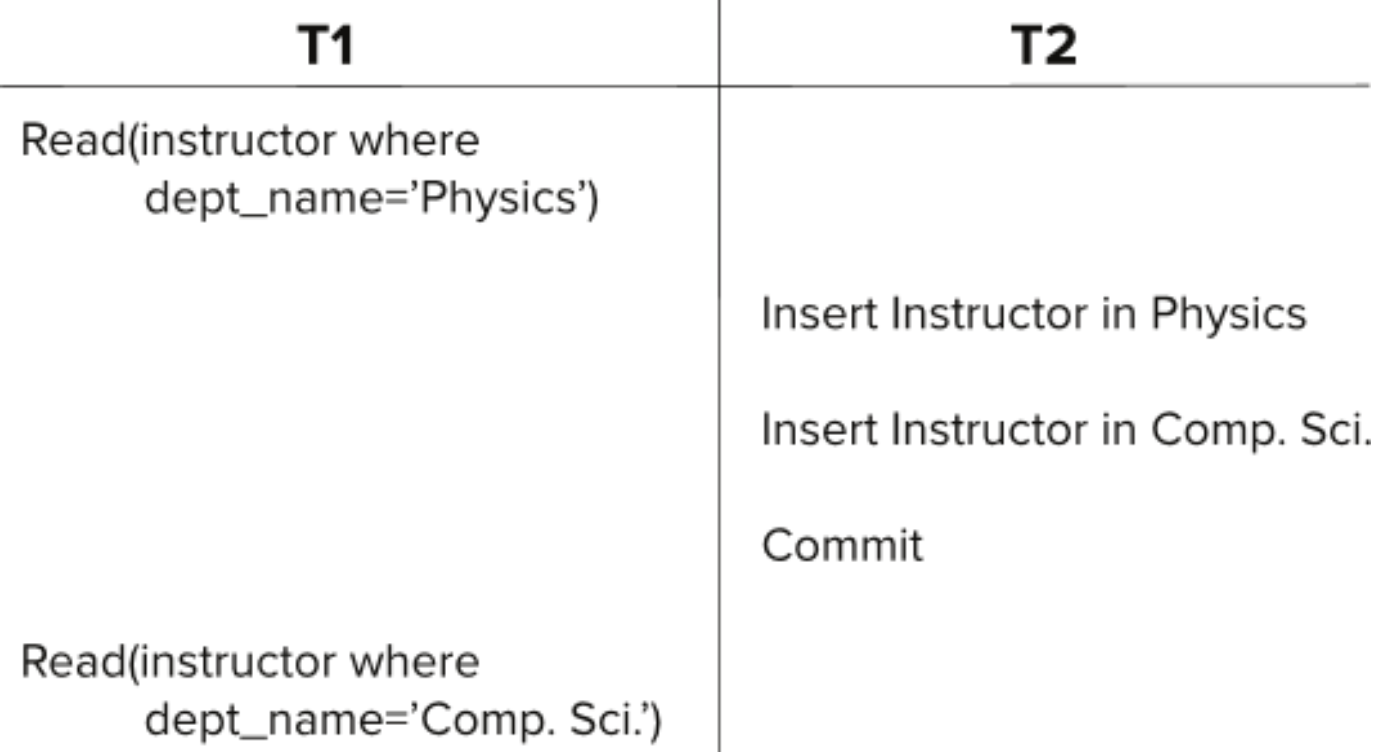 - Insert/Delete 연산 하는 transaction은 data item(table 전체)에 X-lock을 걸게 (tuple 단위 락”과 “table 전체 meta data(data item) 락”은 서로 충돌하지 않는다(독립적이다))