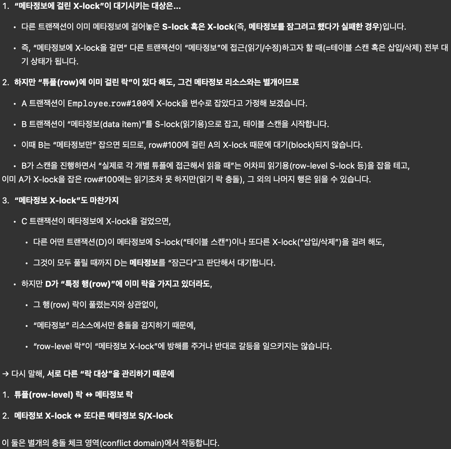 - Intention lock이 걸리지 않은 노드의 자식 노드에 non-intention lock을 거는 걸 혀용하지 않아