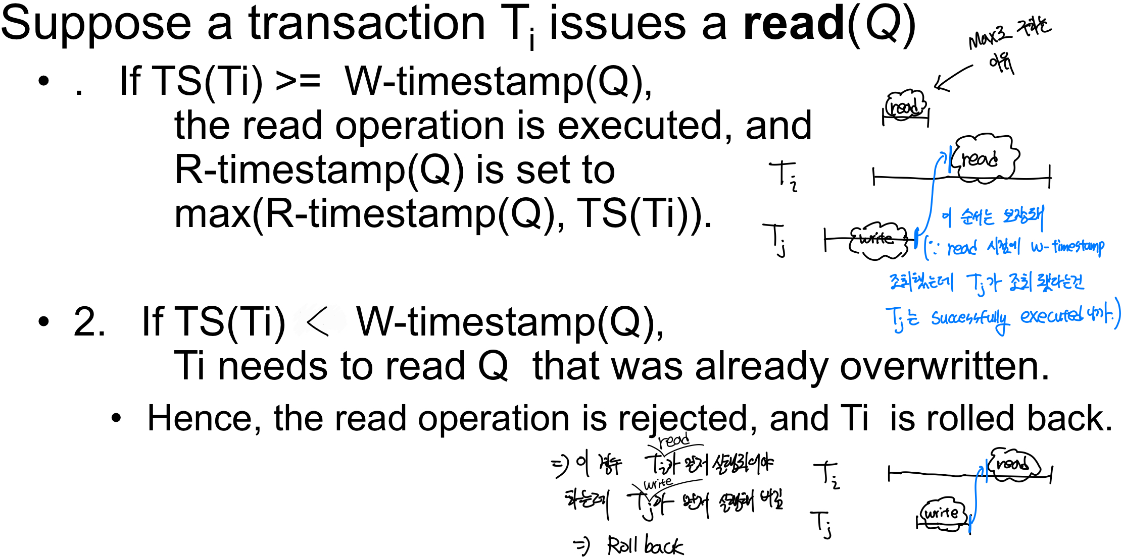 - R-timestamp(Q): Q에 대한 read 연산 transaction 시간 기록 된것 중 가장 큰거