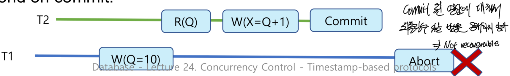 Transaction 순서대로 실행되지 않을수도 있는 경우야(T_i의 경우 실제 transation에서 read가 일어나는 시점까지 detail하게 고려하지 않아, 이미 논리적 모순 존재) => Roll back