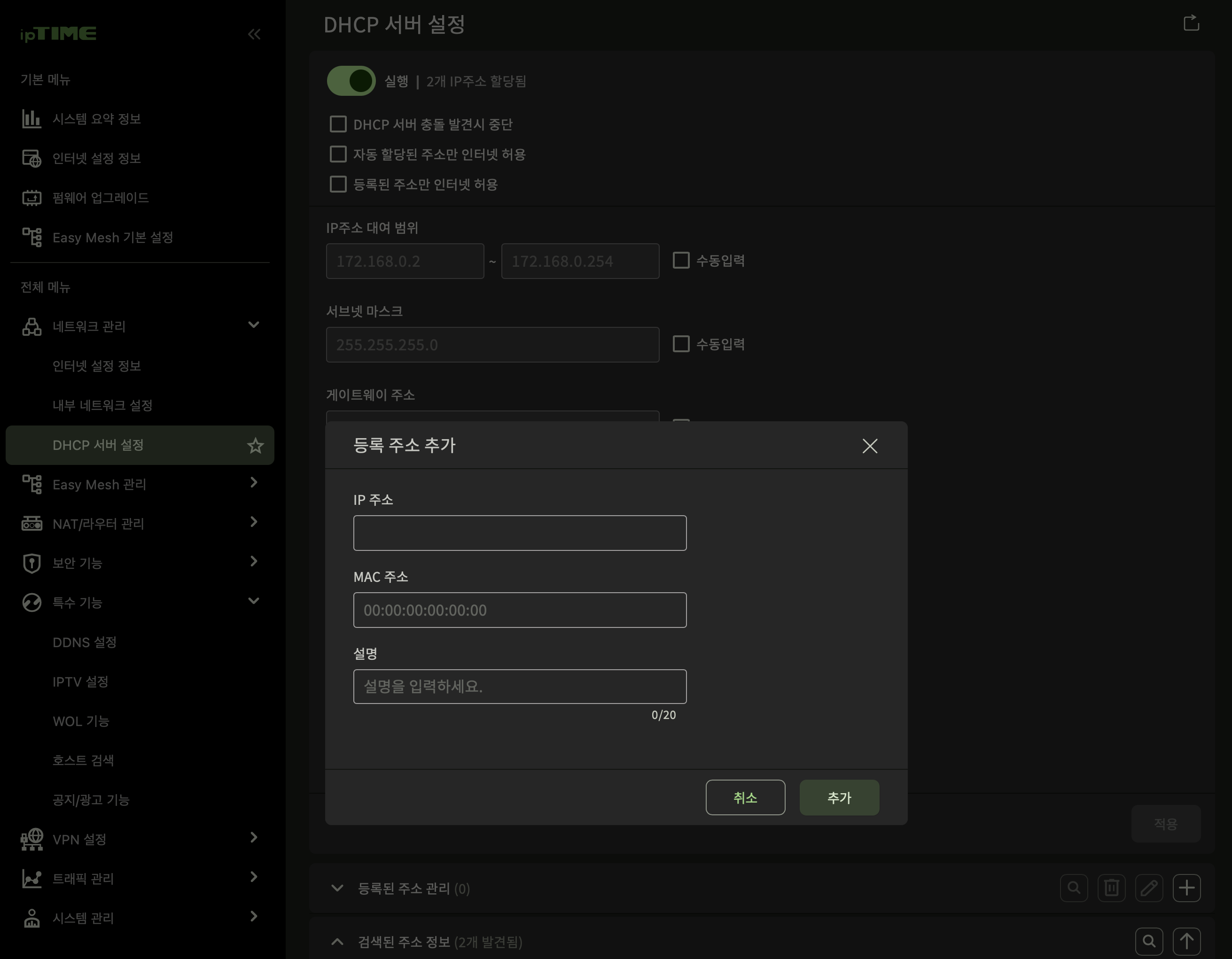 iptime 공유기의 관리자 화면인데 다음과 같이 MAC주소와 할당할 ip주소를 저장하면 그 기기에는 같은 ip만 할당한다.
