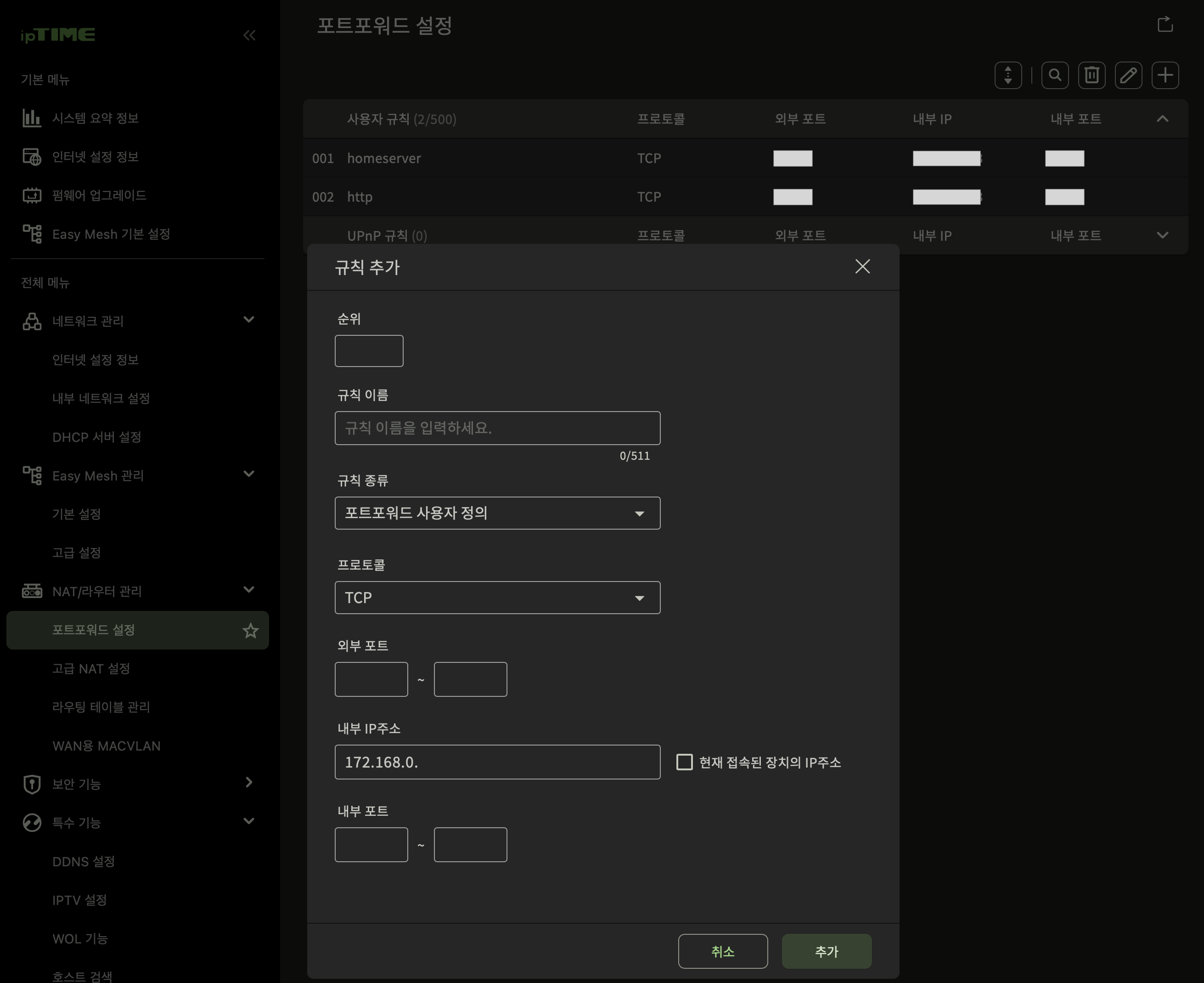 포트포워딩은 다음 화면에서 설정한다.